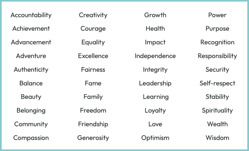 Start by reviewing this list of possible values. Scan it for a few minutes and select five to ten words that resonate with you. Resist thinking about what other people would expect you to choose. All that matters is that your values speak to what’s important to you. If the words on this list don’t capture your values, choose your own.